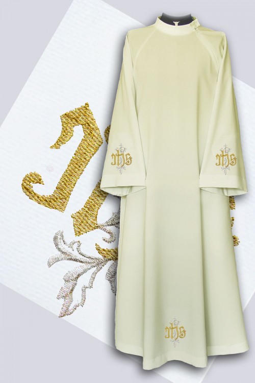 Alba sacerdotal con bordados. Bordado se coloca en ambas mangas, en la parte delantera y trasera de la prenda. Este modelo cuenta con bordado de tejido más grueso con símbolos litúrgicos. Alba con bordado es una propuesta ideal para personas que buscan ropa de alta calidad. Disponible en dos colores: blanco y crema, y en tres tipos de tejidos: gabardina (poliéster), algodón con viscosa (fibra natural con una mezcla) o lana-poliéster.