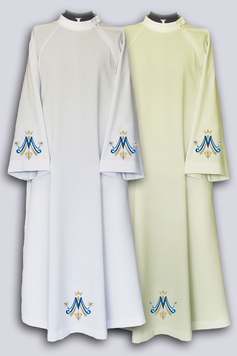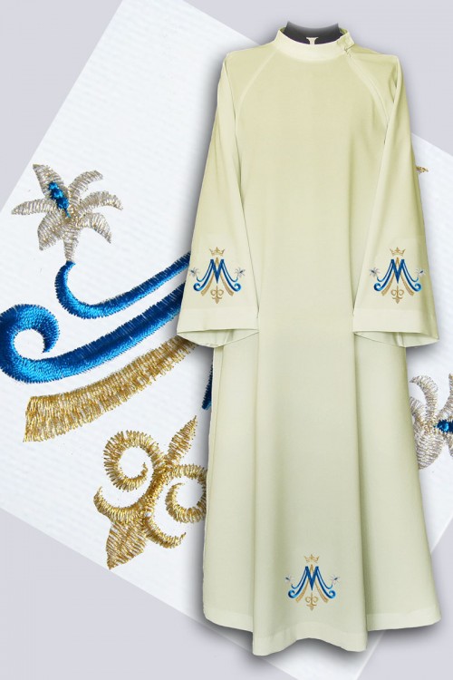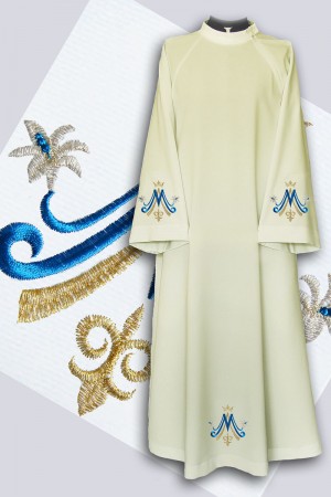 Alba sacerdotal con bordados. Bordado se coloca en ambas mangas, en la parte delantera y trasera de la prenda. Este modelo cuenta con bordado de tejido más grueso con símbolos litúrgicos. Alba con bordado es una propuesta ideal para personas que buscan ropa de alta calidad. Disponible en dos colores: blanco y crema, y en tres tipos de tejidos: gabardina (poliéster), algodón con viscosa (fibra natural con una mezcla) o lana-poliéster.
