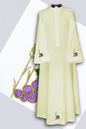 Alba sacerdotal con bordados. Bordado se coloca en ambas mangas, en la parte delantera y trasera de la prenda. Este modelo cuenta con bordado de tejido más grueso con símbolos litúrgicos. Alba con bordado es una propuesta ideal para personas que buscan ropa de alta calidad. Disponible en dos colores: blanco y crema, y en tres tipos de tejidos: gabardina (poliéster), algodón con viscosa (fibra natural con una mezcla) o lana-poliéster.