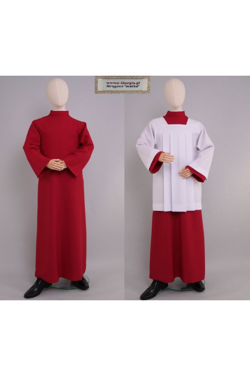 Ropa cuidadosamente confeccionada dedicada a los monaguillos y lectores: alba hecha de poliéster duradero. La alba roja es un atuendo ideal para celebrar la Eucaristía y agrega dignidad al servicio del altar. Alba de corte recto con cuello alto ligeramente acampanado en la parte inferior y abrochado en la espalda.