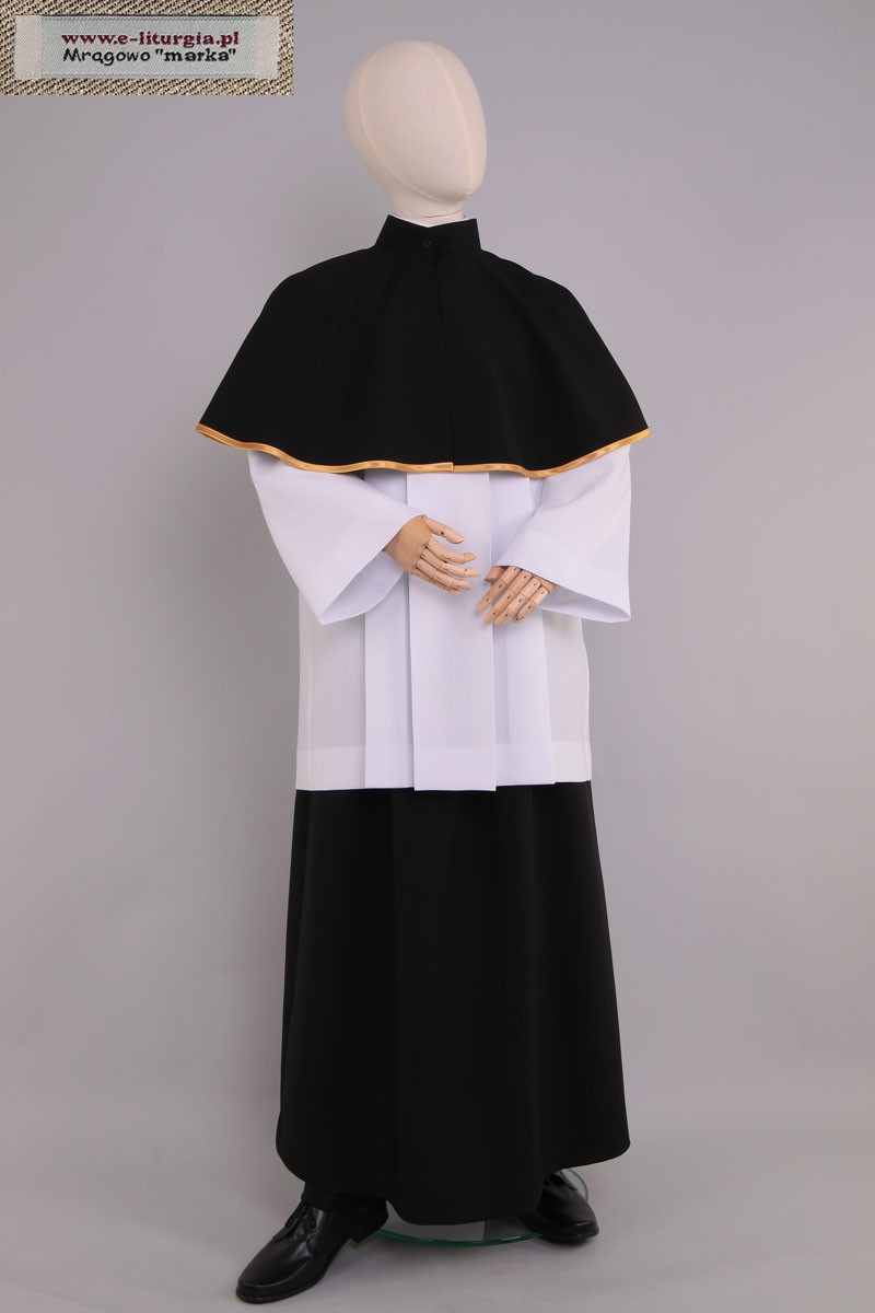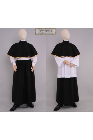 Conjunto de color negro para monaguillos y lectores cuenta con una falda sencilla, ligeramente acampanada en la parte inferior y una capa con cuello alto, decorada con cinta blanca-dorada. Este modelo también está disponible de otros colores.