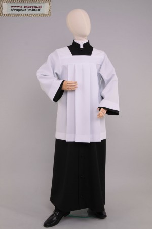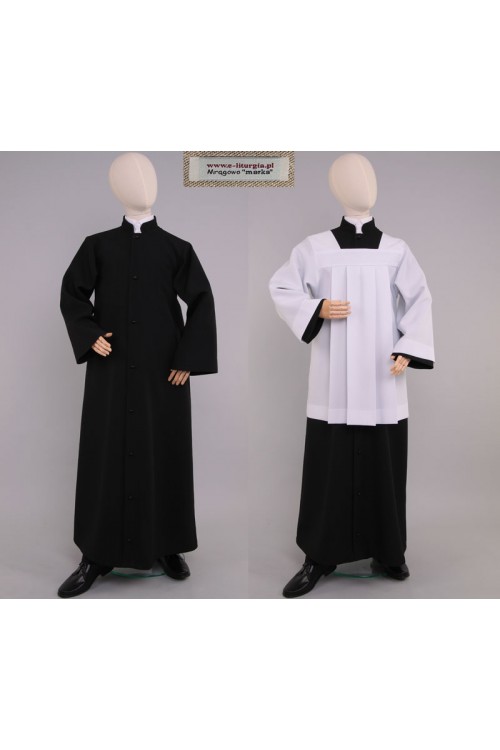 Sotanilla negra larga, con mangas anchas hecha para monaguillos y lectores. Es una vestidura litúrgica sencilla, ligeramente acampanada en la parte inferior. Cuello alto acolchado y botones decorativos le dan un aspecto único. Se abrocha en la parte delantera con cremallera y está disponible en dos versiones de tejido: gabardina o mezcla de algodón y viscosa.