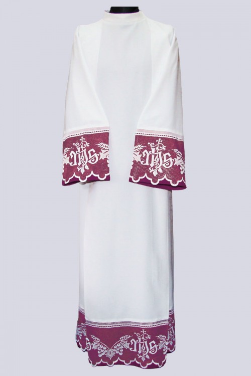 Alba con adornos de tela calada hecha a los prelados. Vestimenta de corte clásico que se distingue por encaje delicado con forro púrpura. Entredoses calados de tejido de poliéster de 22cm de ancho con forro púrpura en las mangas y en la parte inferior de vestimenta. Motivo litúrgico clásico es muy popular y elegante al mismo tiempo. Disponible en dos tipos de material: gabardina (poliéster) y algodón con viscosa.