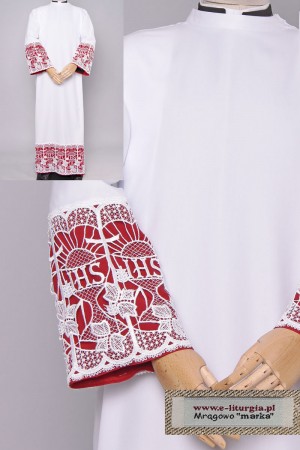 Alba para prelados hecha de tela de algodón natural con viscosa, dedicada a los sacerdotes. Esta vestidura litúrgica única está decorada con guipur de 30cm de ancho, que contrasta maravillosamente con forro de color rojo. Este tipo de encaje ricamente ornamentado está cosido en las mangas y la parte inferior y forrada con tela roja.