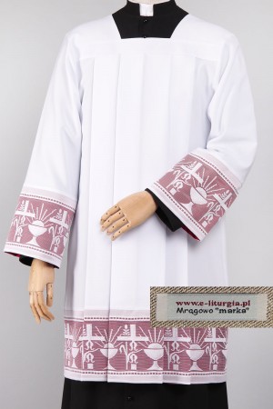 Sobrepelliz con adornos de tela calada hecha a los prelados. Vestimenta de corte clásico que se distingue por encaje delicado con forro rojo. Entredoses calados de tejido de poliéster de 22cm de ancho con forro rojo en las mangas y en la parte inferior de vestimenta. Motivo litúrgico clásico es muy popular y elegante al mismo tiempo. Disponible en dos tipos de material: gabardina (poliéster) y algodón con viscosa.