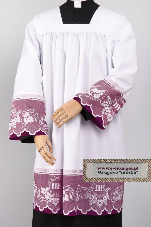 Sobrepelliz con adornos de tela calada hecha a los prelados. Vestimenta de corte clásico que se distingue por encaje delicado con forro púrpura. Entredoses calados de tejido de poliéster de 22cm de ancho con forro púrpura en las mangas y en la parte inferior de vestimenta. Motivo litúrgico clásico es muy popular y elegante al mismo tiempo. Disponible en dos tipos de material: gabardina (poliéster) y algodón con viscosa.