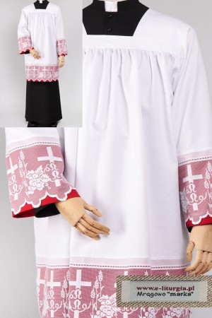 Sobrepelliz con adornos de tela calada hecha a los prelados. Vestimenta de corte clásico que se distingue por encaje delicado con forro rojo. Entredoses calados de tejido de poliéster de 22cm de ancho con forro rojo en las mangas y en la parte inferior de vestimenta. Motivo litúrgico clásico es muy popular y elegante al mismo tiempo. Disponible en dos tipos de material: gabardina (poliéster) y algodón con viscosa.