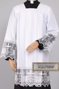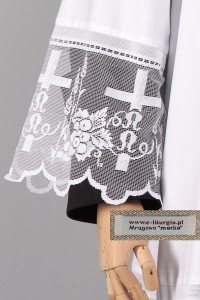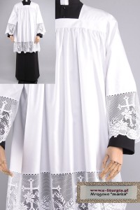 Sobrepellices con motivos calados se presentan muy bonitas y elegantes. Las vestimentas están adornadas con un delicado motivo litúrgico en la parte inferior y en las mangas. Las decoraciones incluyen el adorno de cruz, espigas, vino o Signo Eucarístico. Todos los roquetes están hechos de estilo romano, con pliegues prensados. Hay dos tipos de materiales para elegir: gabardina o algodón con viscosa. Ambos son ligeros, se arrugan poco y se ajustan muy bien al cuerpo.