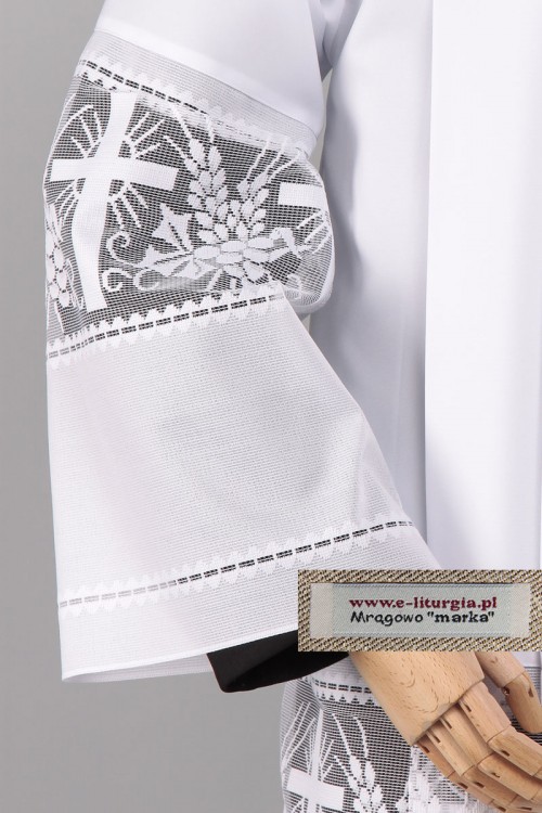 Sobrepelliz sacerdotales de color blanco con delicados adornos calados con motivo litúrgico hermoso. Las mangas y la parte inferior están adornadas con entredoses de encaje. Disponibles en dos tipos de tejido: gabardina (poliéster) y algodón con viscosa.