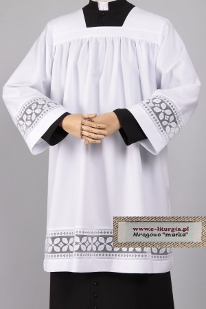 Sobrepelliz sacerdotales de color blanco con delicados adornos calados con motivo litúrgico hermoso. Las mangas y la parte inferior están adornadas con entredoses de encaje. Disponibles en dos tipos de tejido: gabardina (poliéster) y algodón con viscosa.