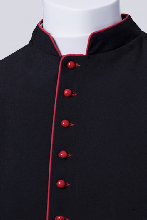 Sotana negra con adornos, botones y ojales rojos está dedicada a los prelados. Sotana de corte típico romano. Clásicamente cosida con tres pliegues y bolsillos. Sotana elegante hecha de tejidos de la máxima calidad. Sotana de trópico italiano es el modelo más comprado y goza de opiniones positivas entre los sacerdotes. Fácil de usar: lavar y planchar sin probelmas.