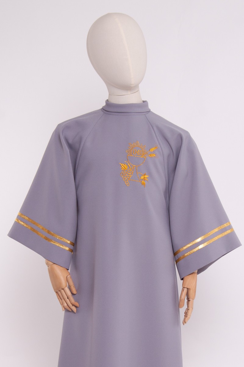 Alba gris hermosa para coros. Esta alba es de corte con cuello de tortuga y mangas anchas de longitud 5/6, que son decoradas cinta dorada. Se abrocha con cremallera.