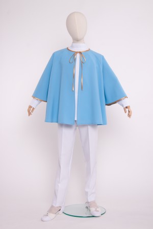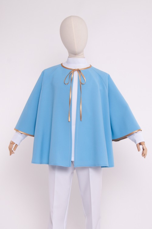 Capa azul claro elegante con mangas hasta el codo, perfecta para coros u otros grupos. Es una idea de vestir niños, adolescentes y adultos. Por su estilo, está dedicada principalmente a niñas y mujeres, pero los niños pueden usarlo en colores oscuros, por ejemplo, azul marino o negro, como contraste. Corte acampanado por las partes frontal y trasera. Mangas anchas. Adornado con cintas de color oro canela – decoración de las mangas y cintas para atar.