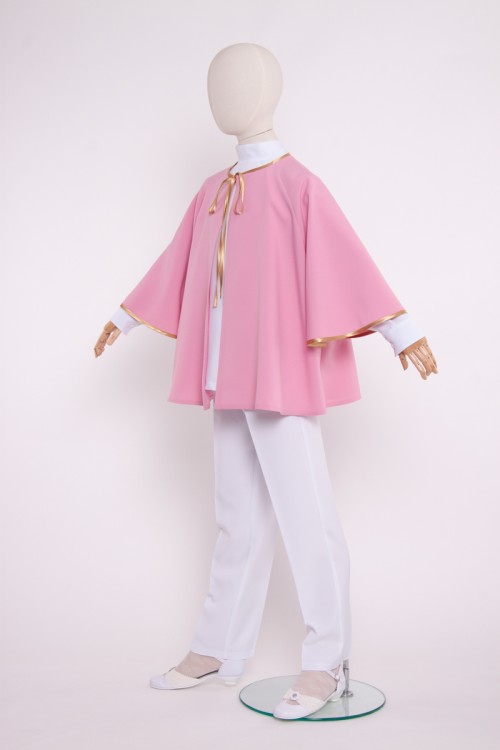 Capa rosa polvo (rosa claro) elegante con mangas hasta el codo, perfecta para coros u otros grupos. Es una idea de vestir niños, adolescentes y adultos. Por su estilo, está dedicada principalmente a niñas y mujeres, pero los niños pueden usarlo en colores oscuros, por ejemplo, azul marino o negro, como contraste. Corte acampanado por las partes frontal y trasera. Mangas anchas. Adornado con cintas de color oro canela – decoración de las mangas y cintas para atar.